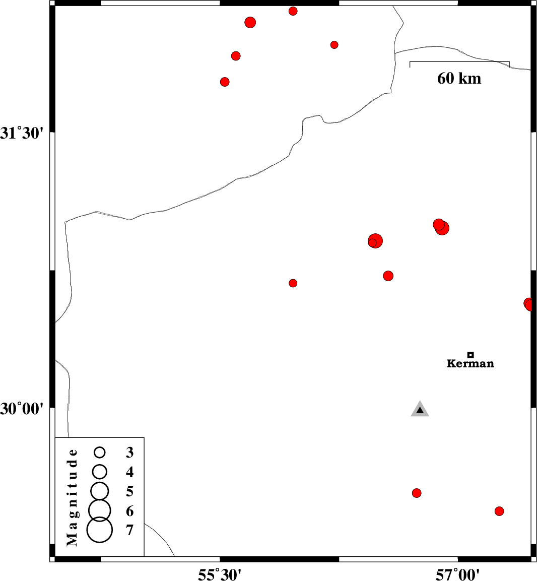 2014/04/11 | 23:36:13.3 | 04:06:13.3 | 30.98 | 56.9 | 14 | ML:4 | Kerman Province, 33 km South of Ravar | ||