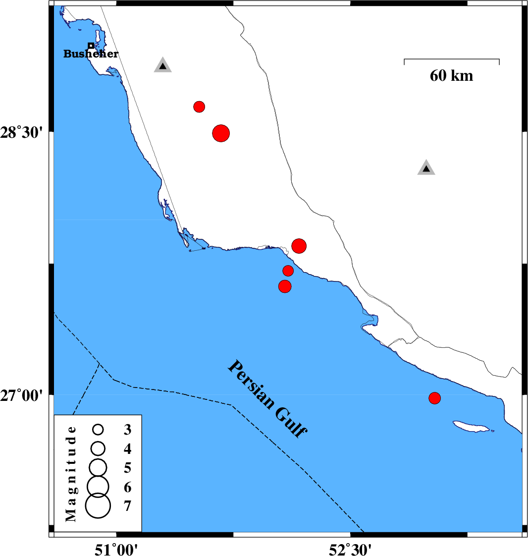 2014/04/25 | 01:48:29.7 | 06:18:29.7 | 27.62 | 52.08 | 33 | ML:3.7 | Persian Gulf, 24 km South of Bandar-e kangan | ||