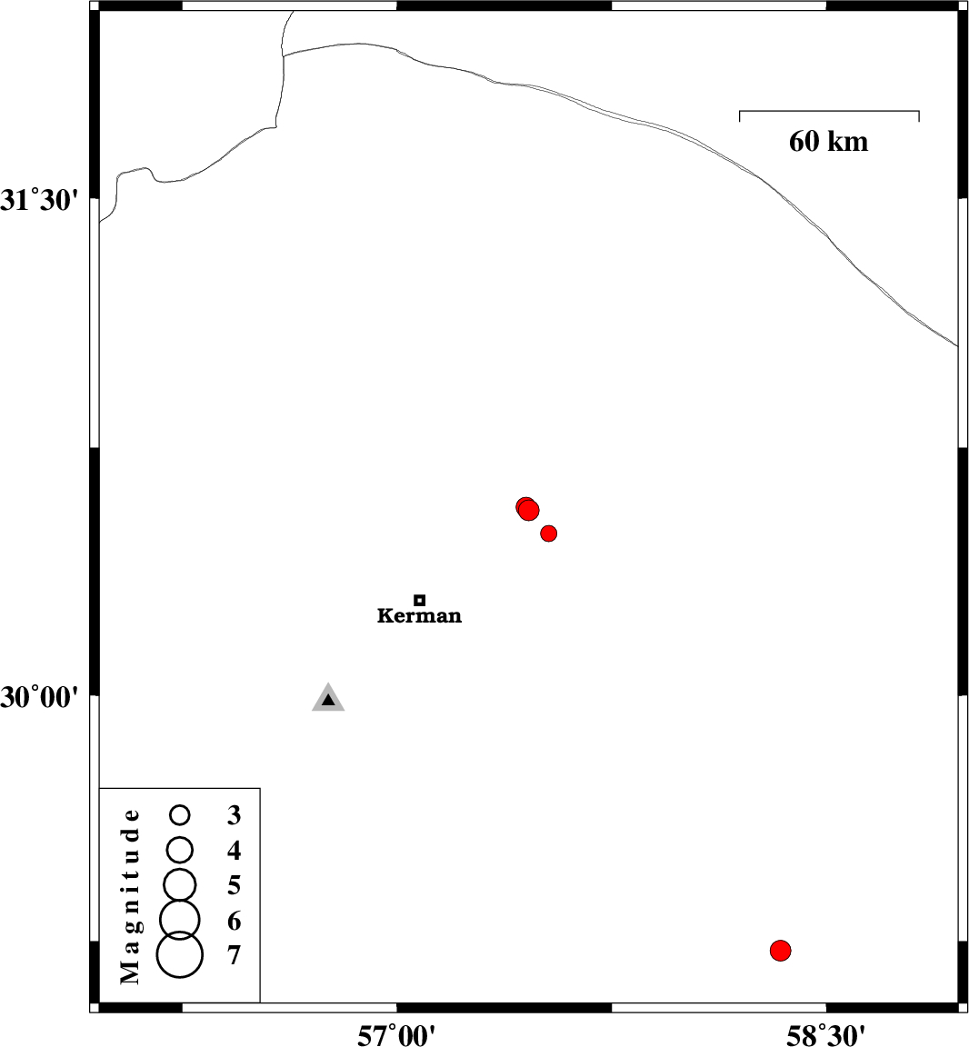 2014/04/23 | 20:00:49.3 | 00:30:49.3 | 29.22 | 58.34 | 14 | ML:3.2 | Kerman Province, 13 km North of Bam | ||