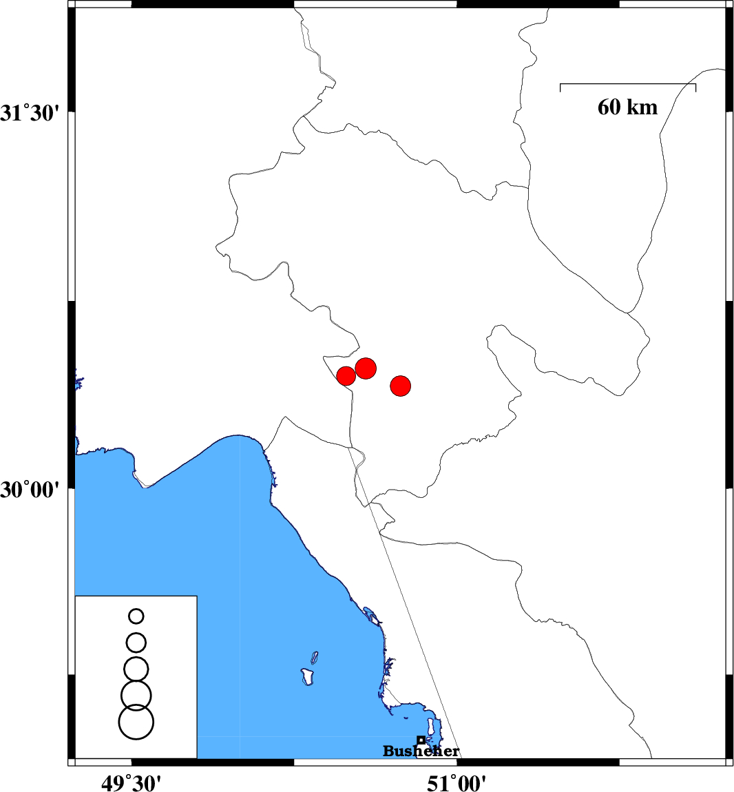 2014/04/24 | 07:44:29.3 | 12:14:29.3 | 30.45 | 50.49 | 18 | ML:3.9 | Kohkiluieh va boyerahmad Province, 28 km South-East of Behbahan | ||