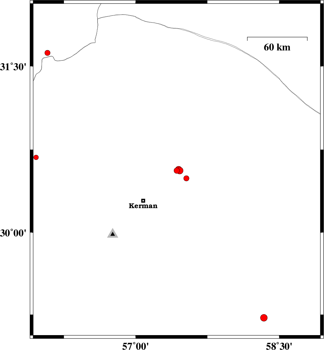 2014/04/23 | 11:15:41.9 | 15:45:41.9 | 30.57 | 57.45 | 14 | ML:2.8 | Kerman Province, 47 km North-East of Kerman |