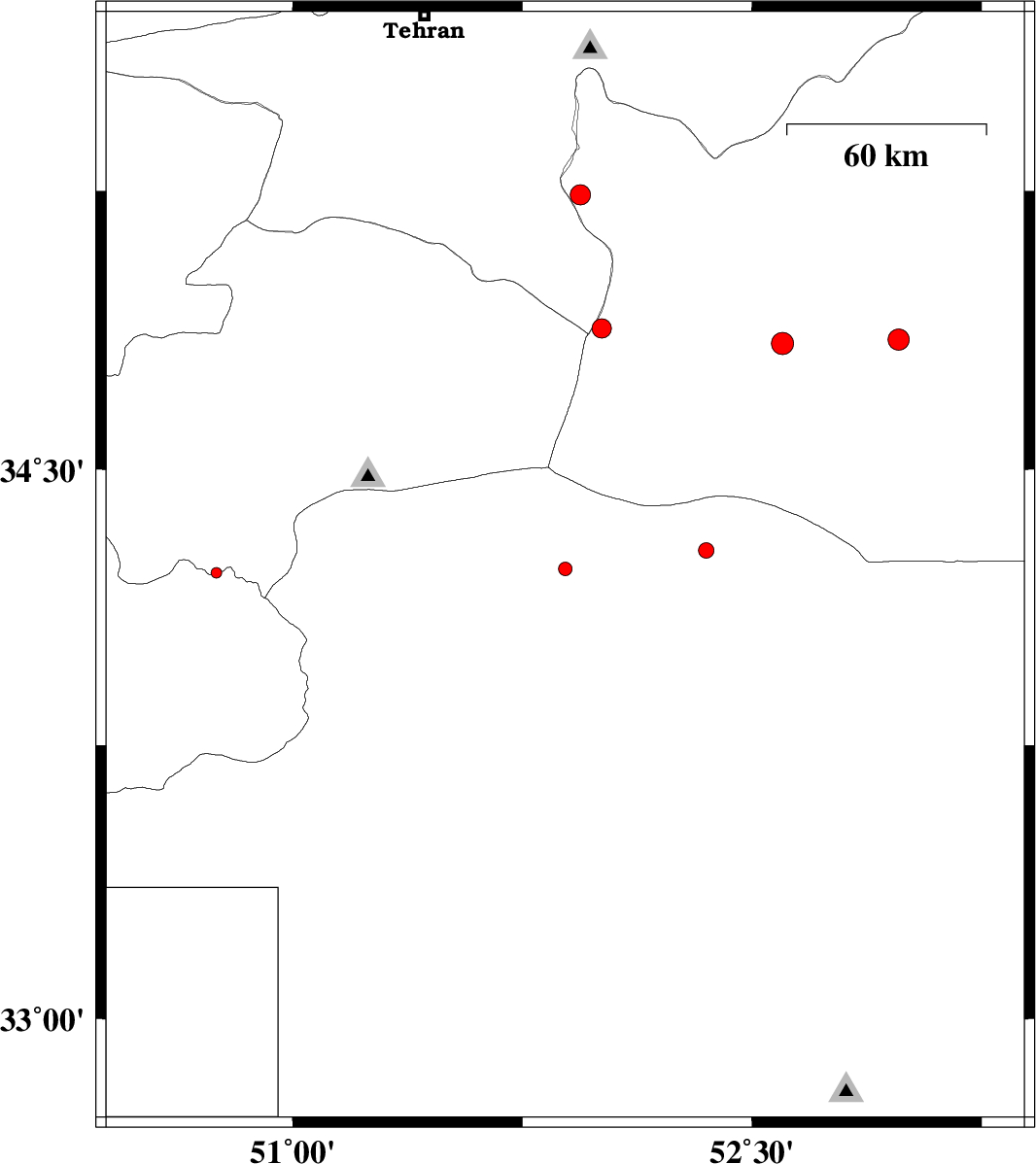 2014/04/14 | 16:26:10.9 | 20:56:10.9 | 34.84 | 52.6 | 15 | ML:3.3 | Semnan Province, 49 km South-East of Garmsar | ||