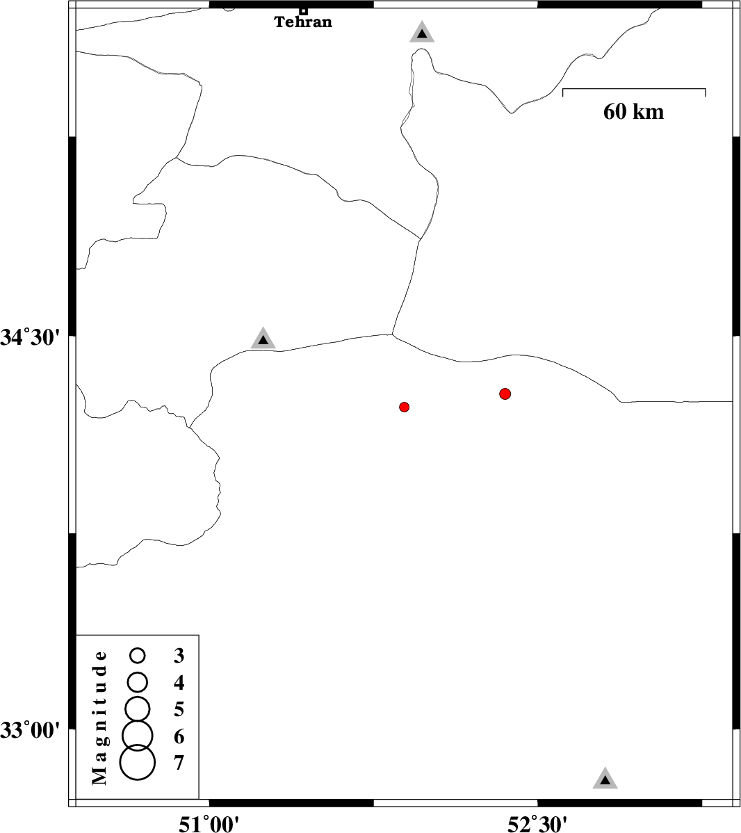 | 2014/04/22 | 23:46:47.8 | 04:16:47.8 | 34.28 | 52.35 | 14 | ML:2.2 | Esfahan Province, 100 km North of Ardestan |