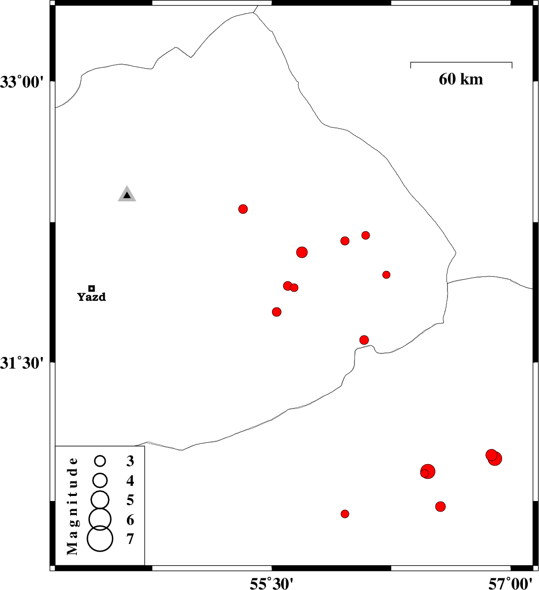 2014/04/11 | 23:36:13.3 | 04:06:13.3 | 30.98 | 56.9 | 14 | ML:4 | Kerman Province, 33 km South of Ravar | ||