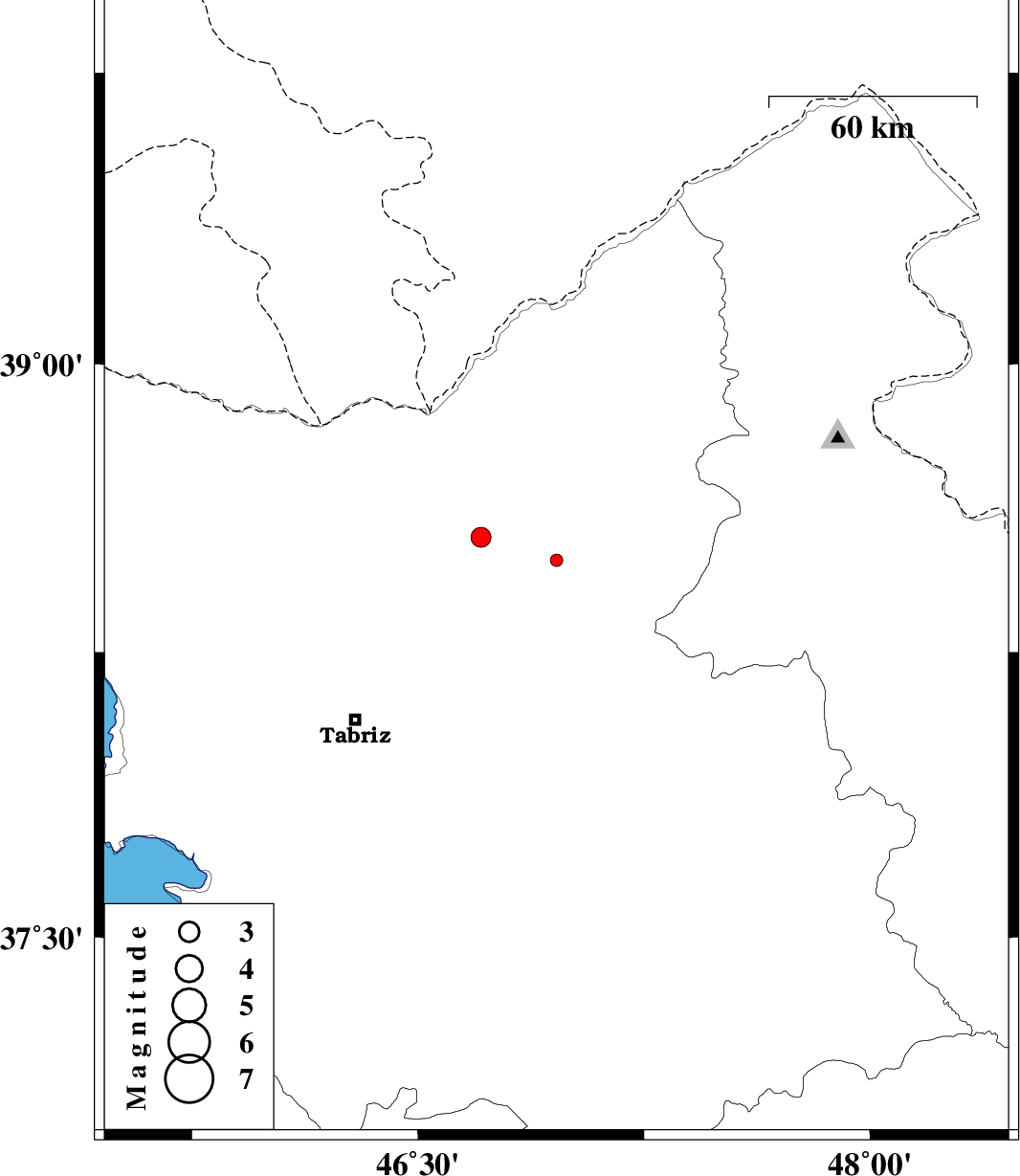 2014/04/29 | 01:44:53.4 | 06:14:53.4 | 38.49 | 46.96 | 6 | ML:1.8 | Azarbaijan Sharghi Province, 10 km West of Ahar | ||