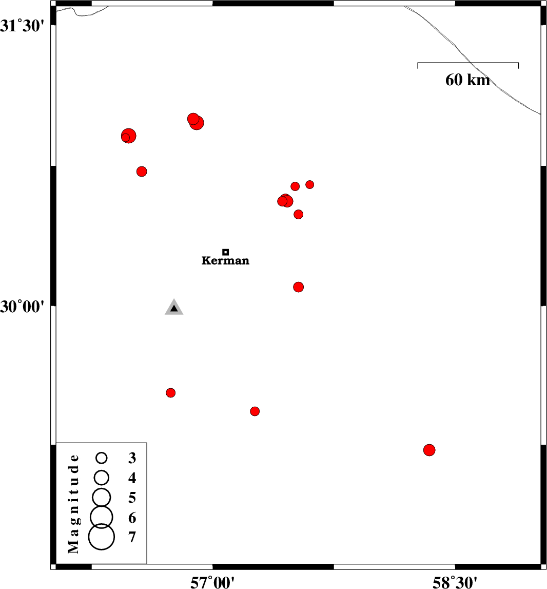 2014/04/29 | 04:57:59.3 | 09:27:59.3 | 30.1 | 57.53 | 18 | ML:2.8 | Kerman Province, 48 km South-East of Kerman | ||