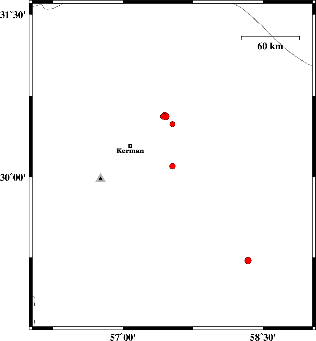 2014/04/29 | 04:57:59.3 | 09:27:59.3 | 30.1 | 57.53 | 18 | ML:2.8 | Kerman Province, 48 km South-East of Kerman | ||