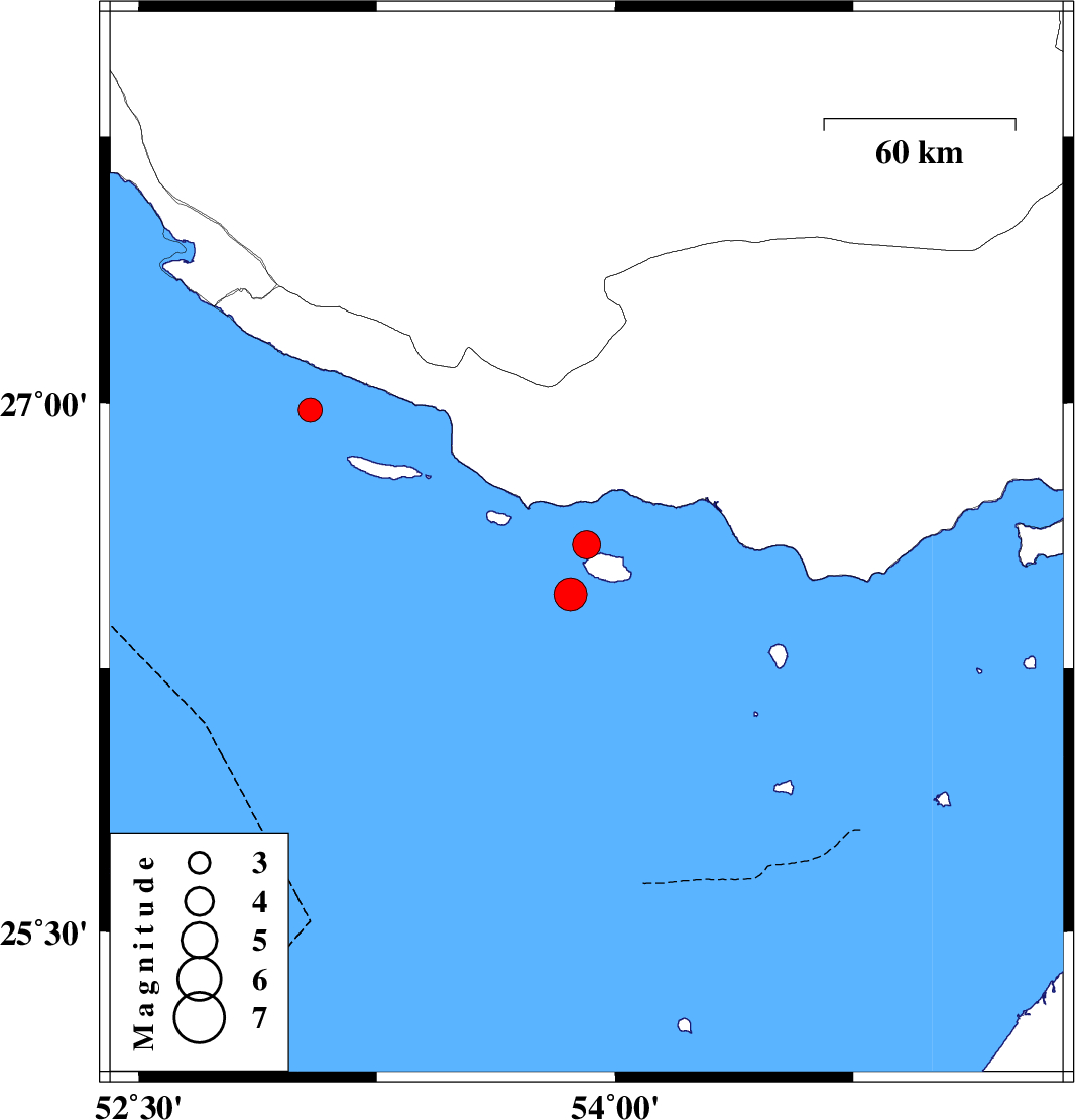 2014/04/12 | 22:09:32.0 | 02:39:32.0 | 26.98 | 53.04 | 18 | ML:3.4 | Persian Gulf, 42 km South-West of Lamerd |
