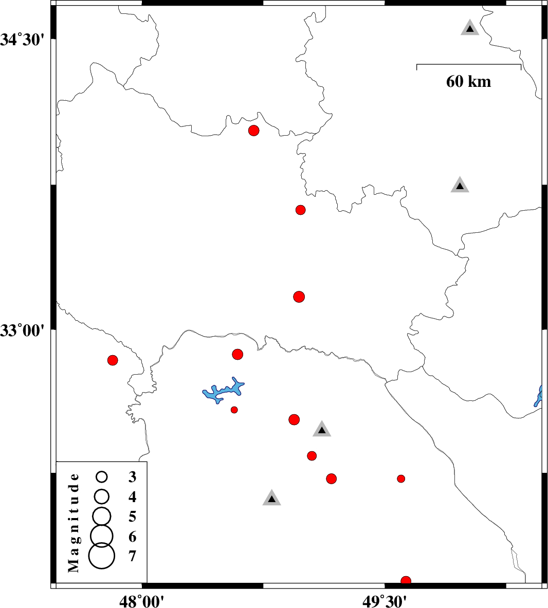 2014/05/03 | 16:24:43.1 | 20:54:43.1 | 33.17 | 48.97 | 14 | ML:3.1 | Lorestan Province, 35 km South of Dorud | ||
