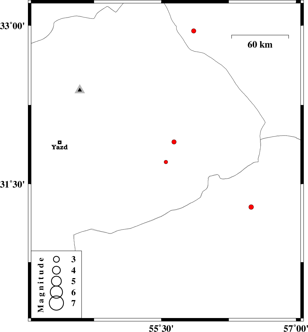 2014/05/05 | 18:19:31.3 | 22:49:31.3 | 32.95 | 55.86 | 14 | ML:2.3 | Yazd Province, 123 km South-West of Tabas | ||