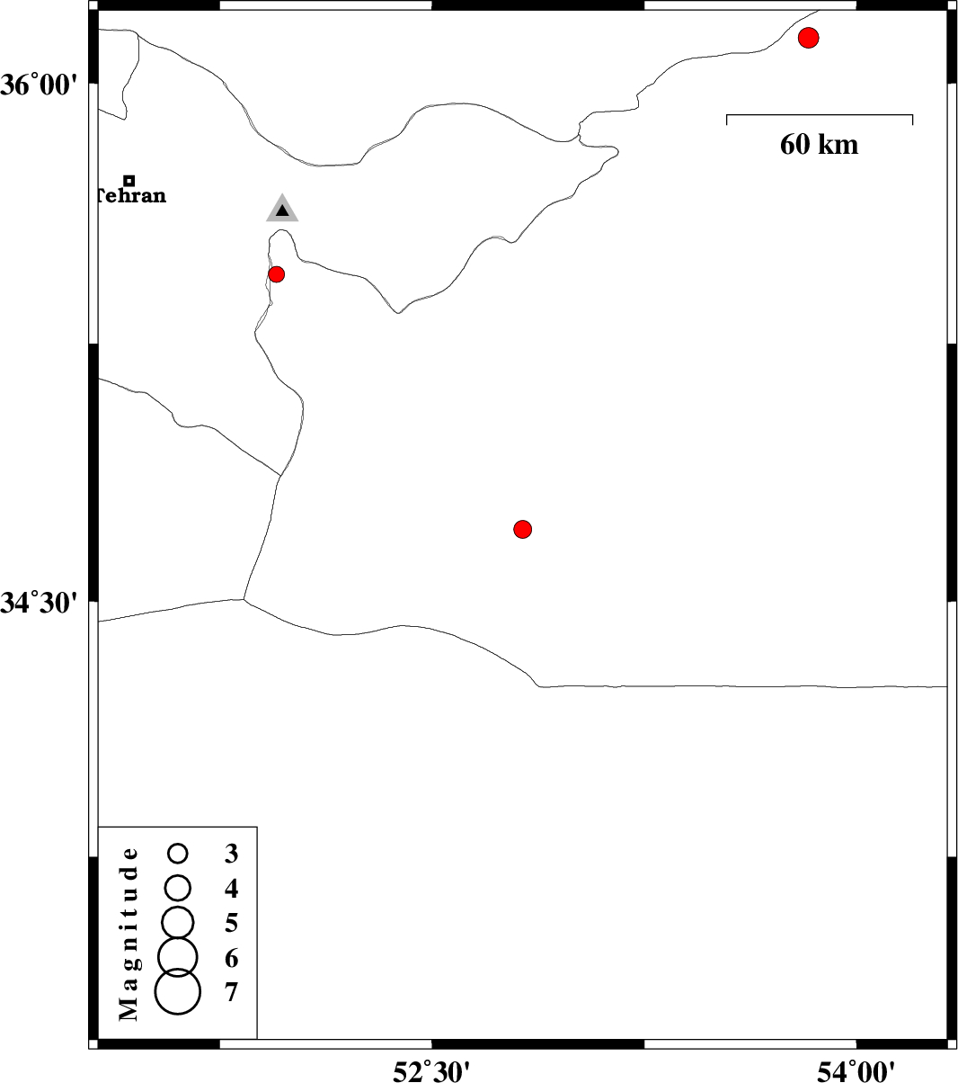 | 2014/05/07 | 19:56:15.6 | 00:26:15.6 | 34.71 | 52.82 | 14 | ML:2.8 | Semnan Province, 72 km South-East of Garmsar | ||