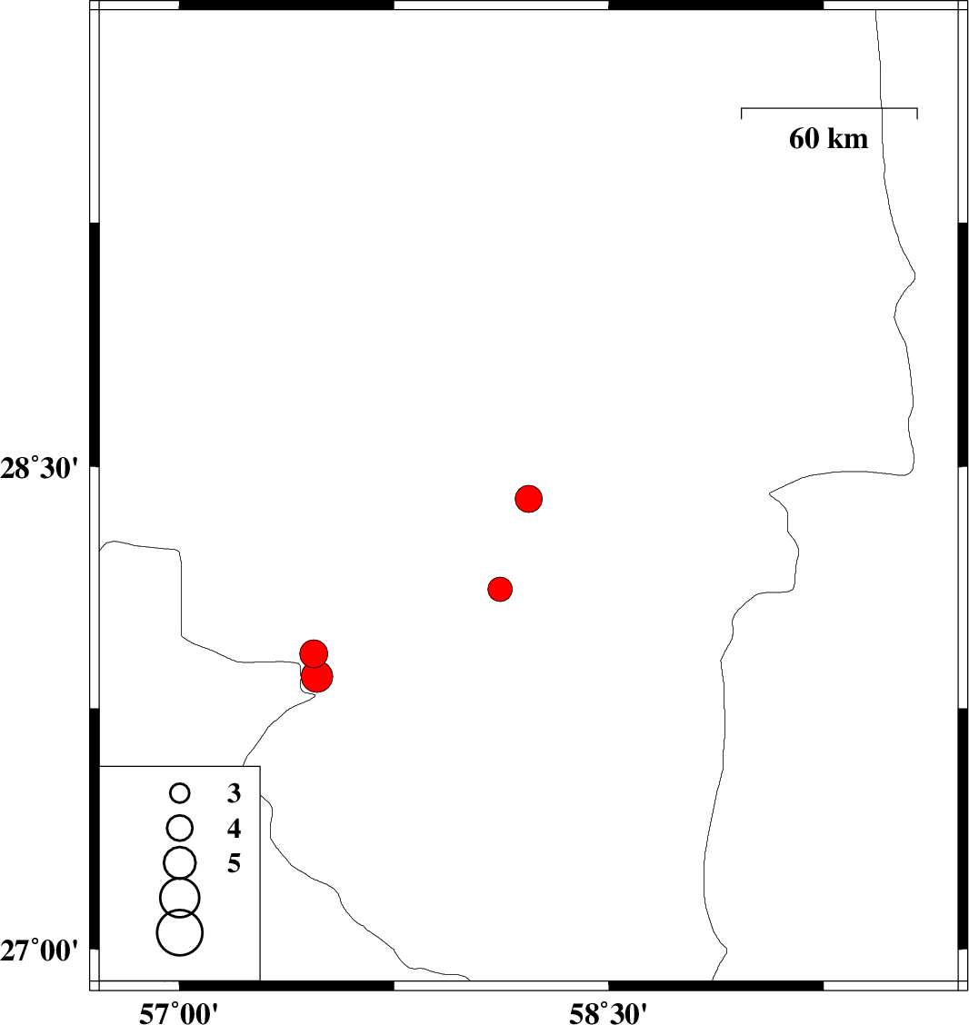 2014/05/09 | 00:08:43.7 | 04:38:43.7 | 27.85 | 57.48 | 14 | ML:4.9 | Kerman Province, 24 km South-West of Kahnuj | ||