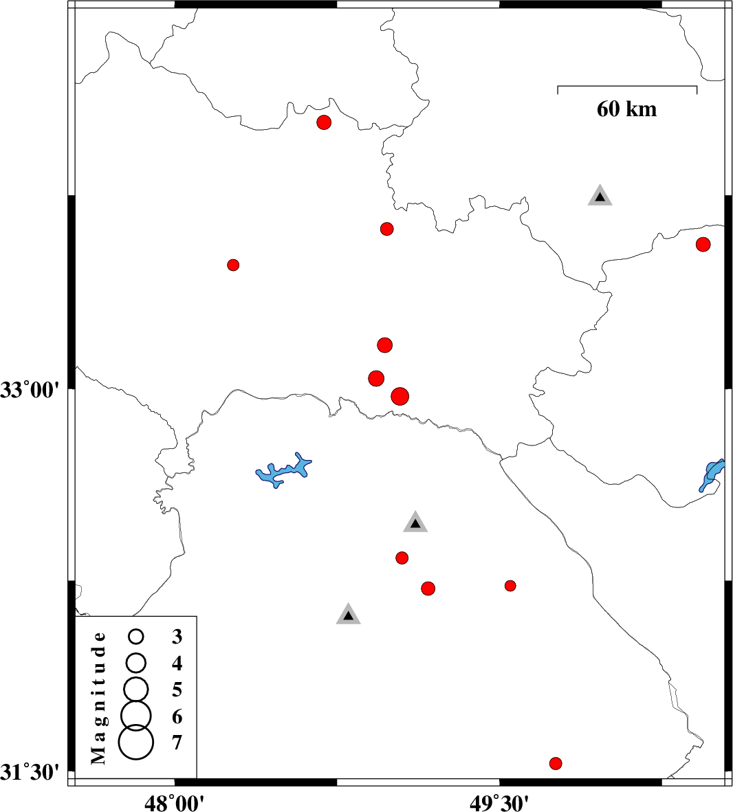 2014/05/15 | 07:49:17.8 | 12:19:17.8 | 33.04 | 48.93 | 6 | ML:3.2 | Lorestan Province, 51 km South-West of Dorud | ||