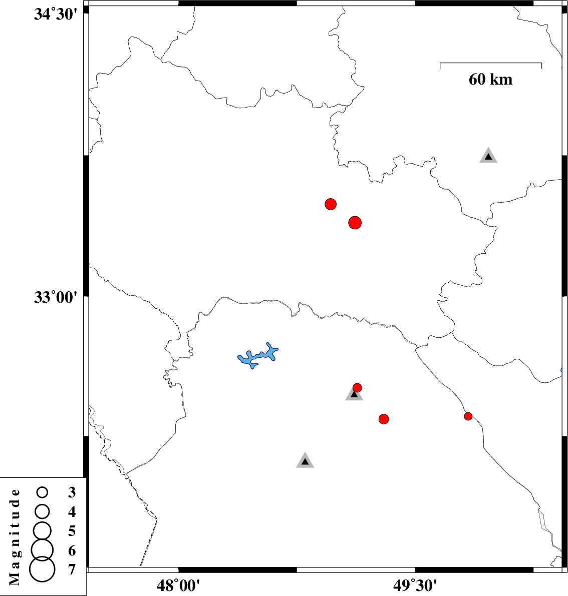 2014/05/15 | 07:49:17.8 | 12:19:17.8 | 33.04 | 48.93 | 6 | ML:3.2 | Lorestan Province, 51 km South-West of Dorud | ||