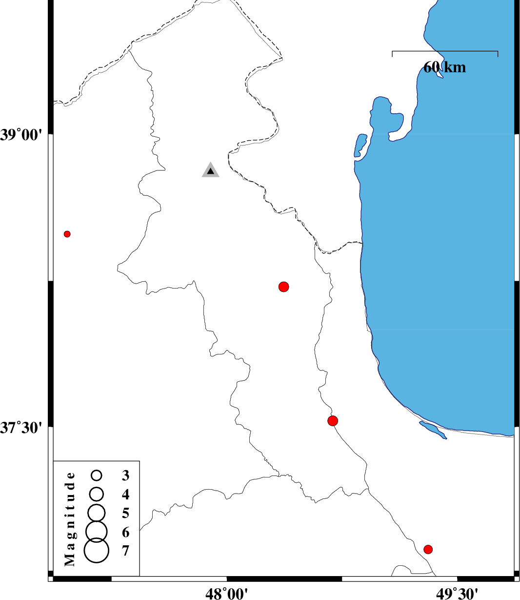 2014/04/29 | 01:44:53.4 | 06:14:53.4 | 38.49 | 46.96 | 6 | ML:1.8 | Azarbaijan Sharghi Province, 10 km West of Ahar |