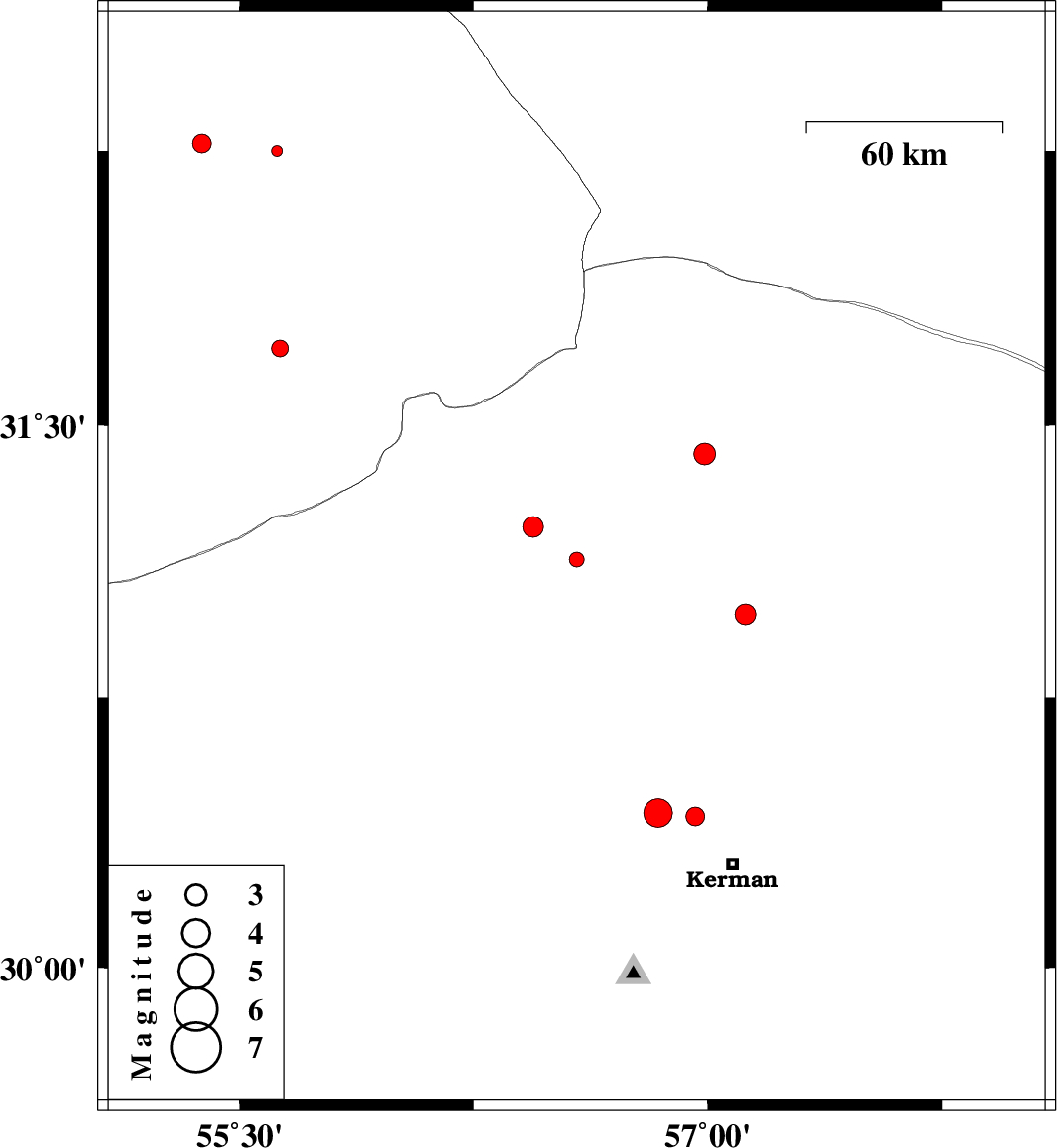 2014/05/12 | 06:45:40.5 | 11:15:40.5 | 30.43 | 56.84 | 15 | ML:4.1 | Kerman Province, 28 km North-West of Kerman | ||