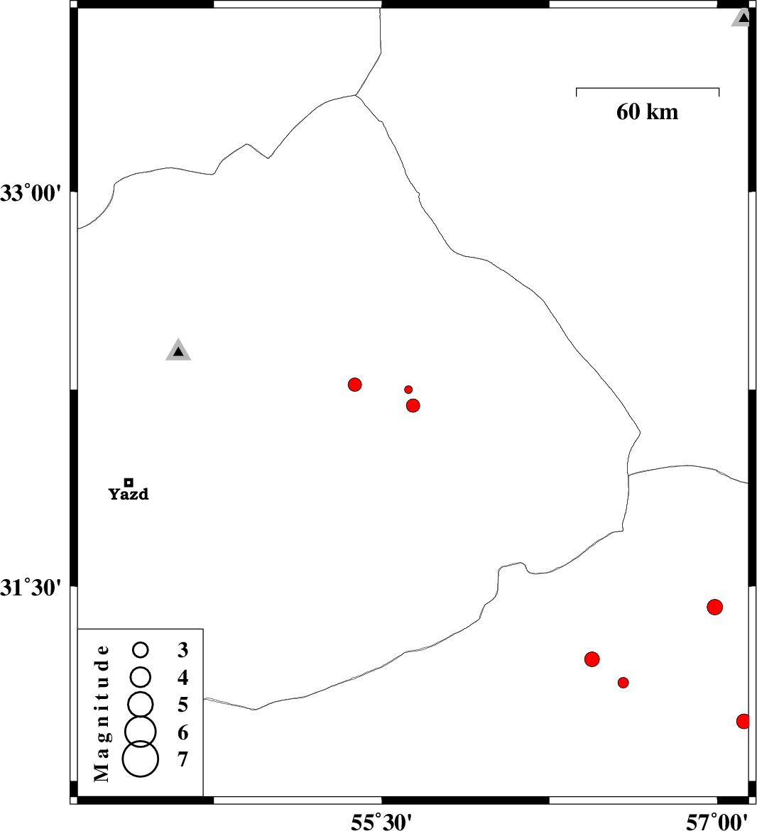 2014/05/12 | 04:00:16.4 | 08:30:16.4 | 32.27 | 55.38 | 14 | ML:2.7 | Yazd Province, 75 km North of Bafq |