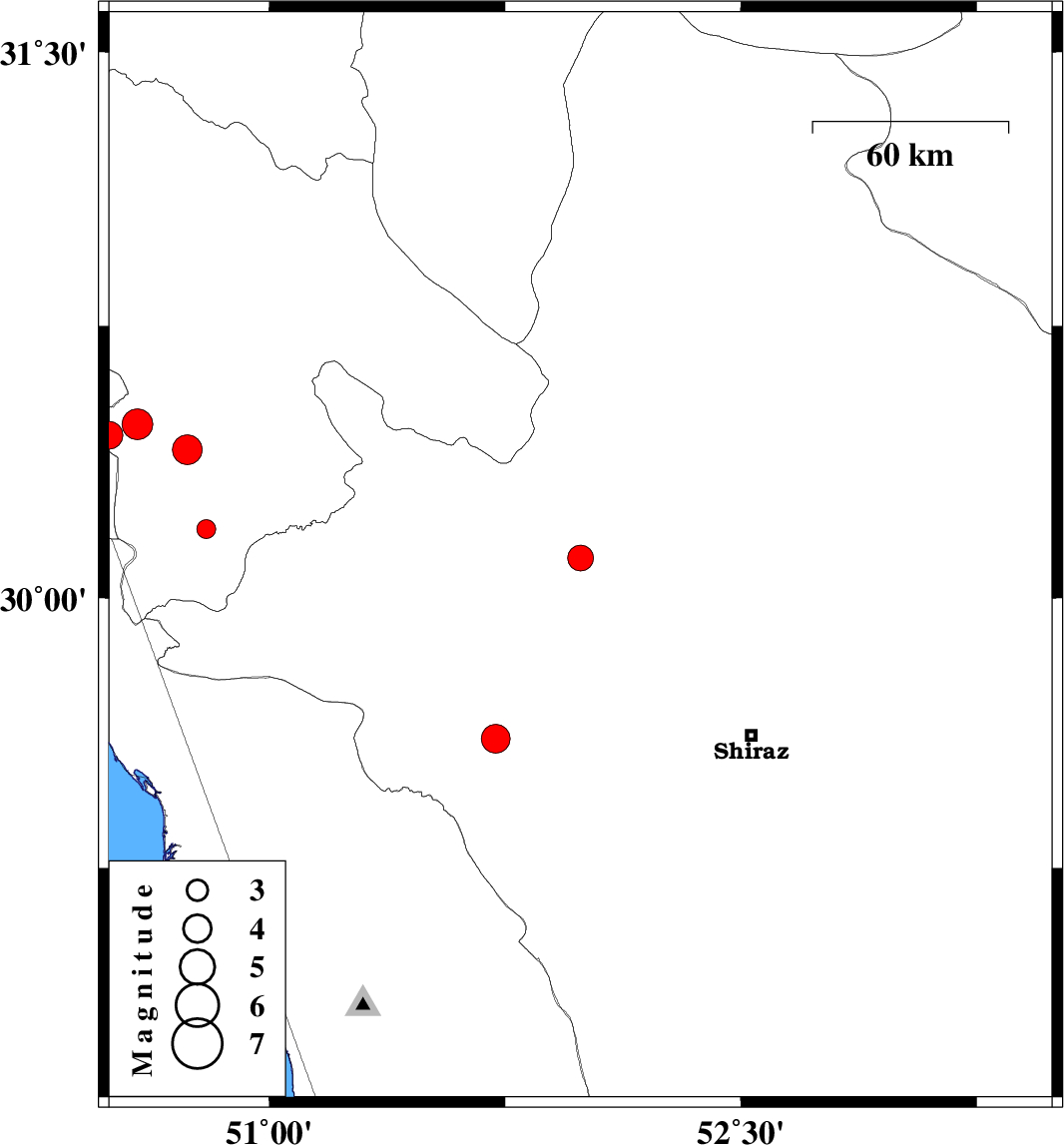 2014/05/19 | 14:56:44.3 | 19:26:44.3 | 30.11 | 51.99 | 18 | ML:3.7 | Fars Province, 17 km South of Ardakan | ||