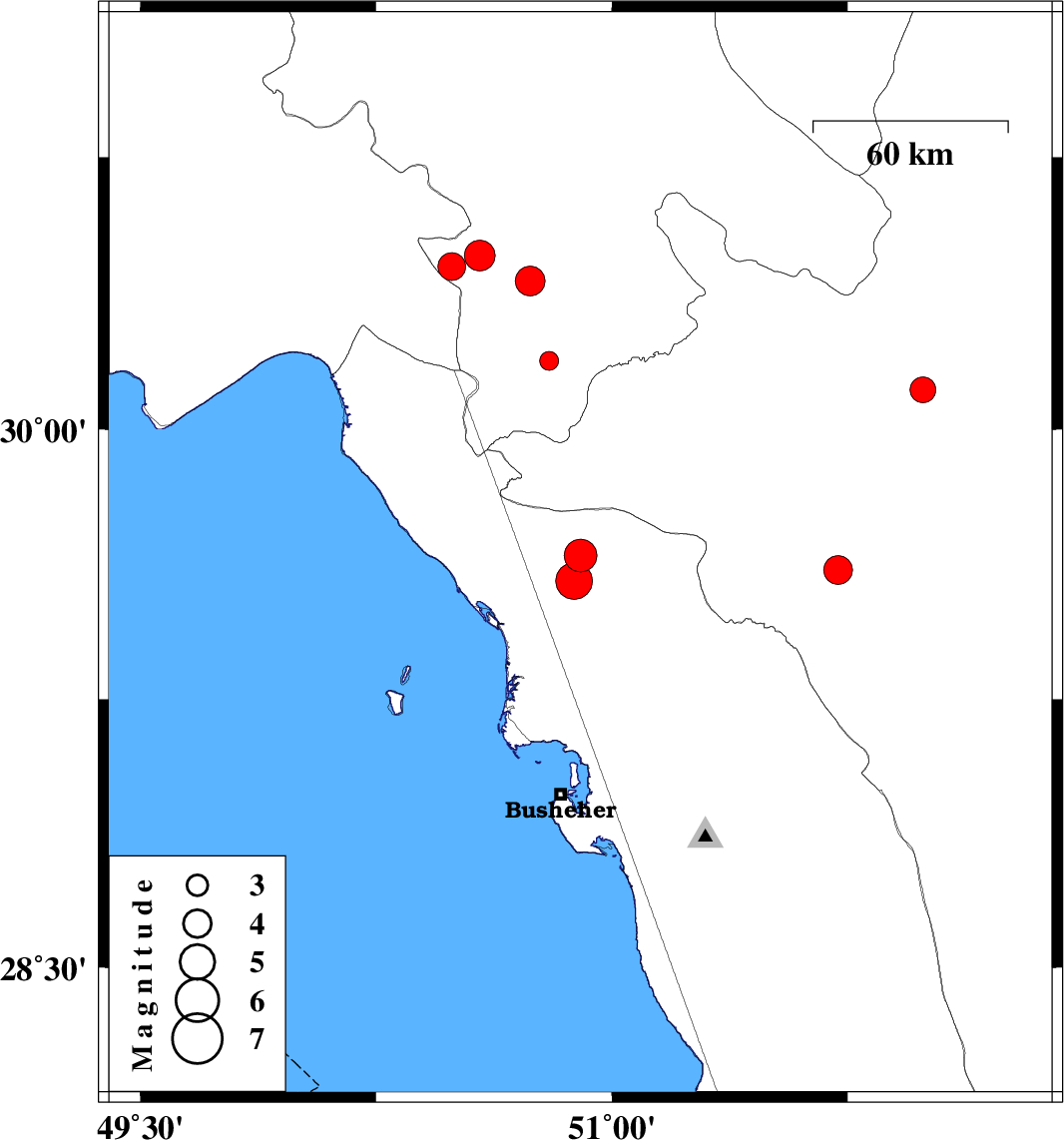 | 2014/05/21 | 09:46:29.1 | 14:16:29.1 | 29.58 | 50.88 | 18 | ML:5.2 | Bushehr Province, 35 km East of Bandar-e genaveh | ||