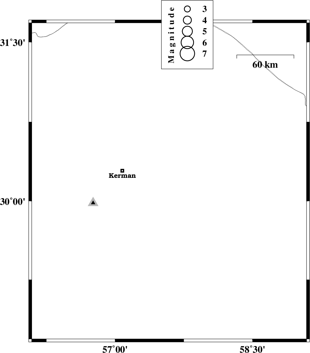 2014/04/29 | 04:57:59.3 | 09:27:59.3 | 30.1 | 57.53 | 18 | ML:2.8 | Kerman Province, 48 km South-East of Kerman | ||