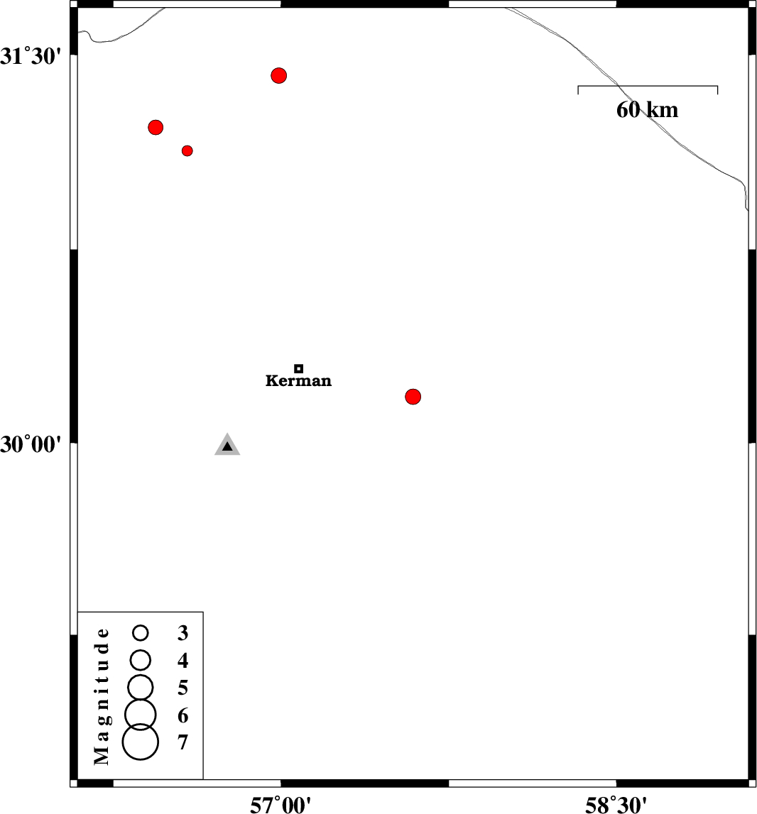 2014/05/14 | 17:52:37.9 | 22:22:37.9 | 31.22 | 56.44 | 14 | ML:3 | Kerman Province, 36 km West of Ravar |