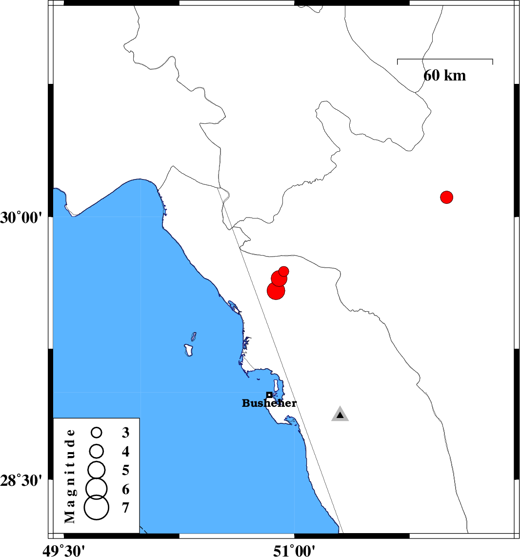 | 2014/05/22 | 18:01:27.7 | 22:31:27.7 | 29.69 | 50.93 | 18 | ML:2.9 | Bushehr Province, 42 km North-East of Bandar-e genaveh | ||