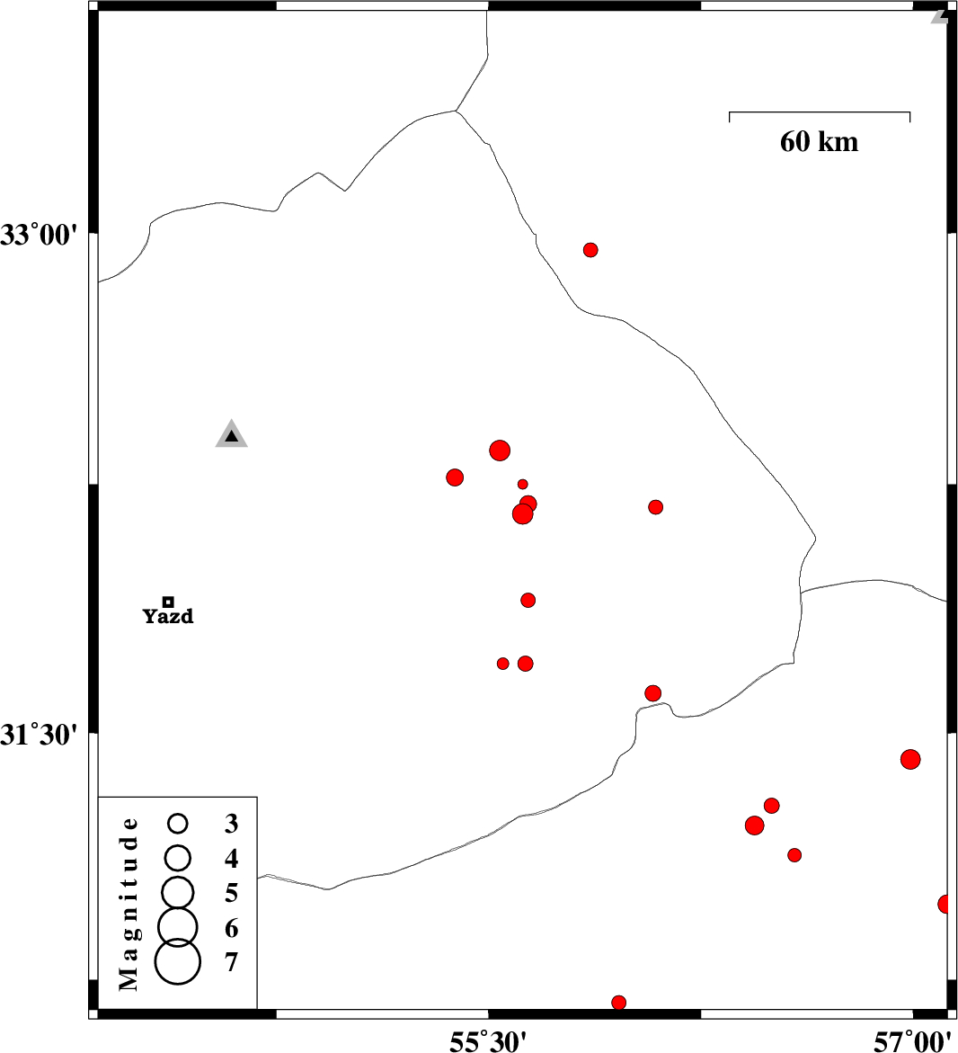 2014/05/16 | 02:10:15.2 | 06:40:15.2 | 32.25 | 55.62 | 14 | ML:1.6 | Yazd Province, 75 km North-East of Bafq | ||