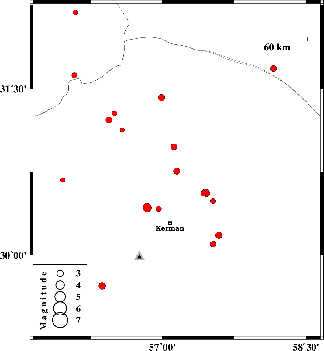 2014/04/29 | 04:57:59.3 | 09:27:59.3 | 30.1 | 57.53 | 18 | ML:2.8 | Kerman Province, 48 km South-East of Kerman | ||
