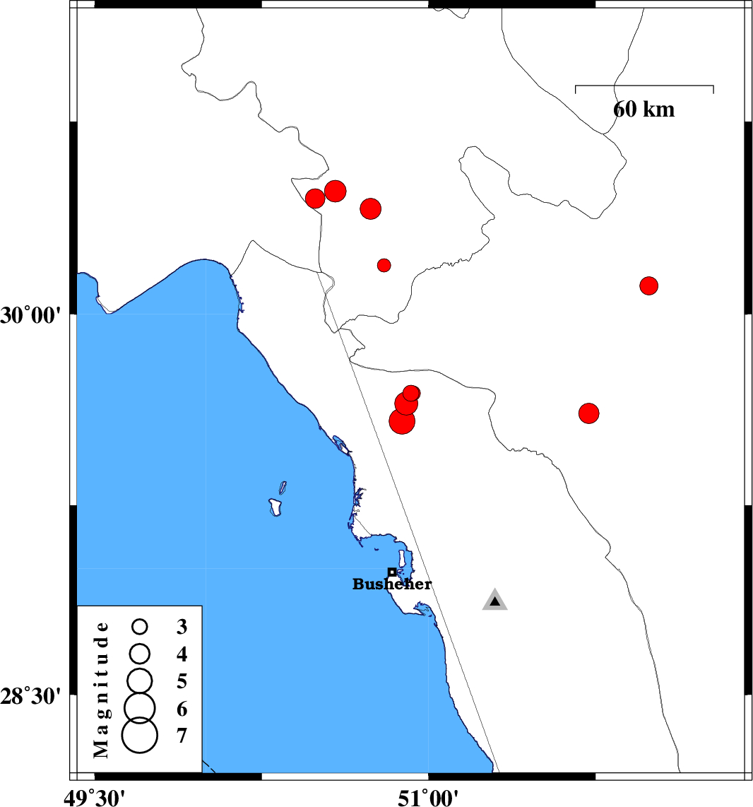 2014/05/21 | 13:25:22.1 | 17:55:22.1 | 29.65 | 50.9 | 18 | ML:4.6 | Bushehr Province, 38 km East of Bandar-e genaveh | ||