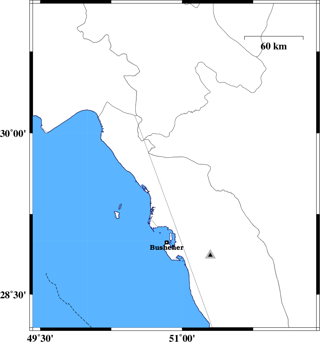 2014/05/21 | 13:25:22.1 | 17:55:22.1 | 29.65 | 50.9 | 18 | ML:4.6 | Bushehr Province, 38 km East of Bandar-e genaveh | ||