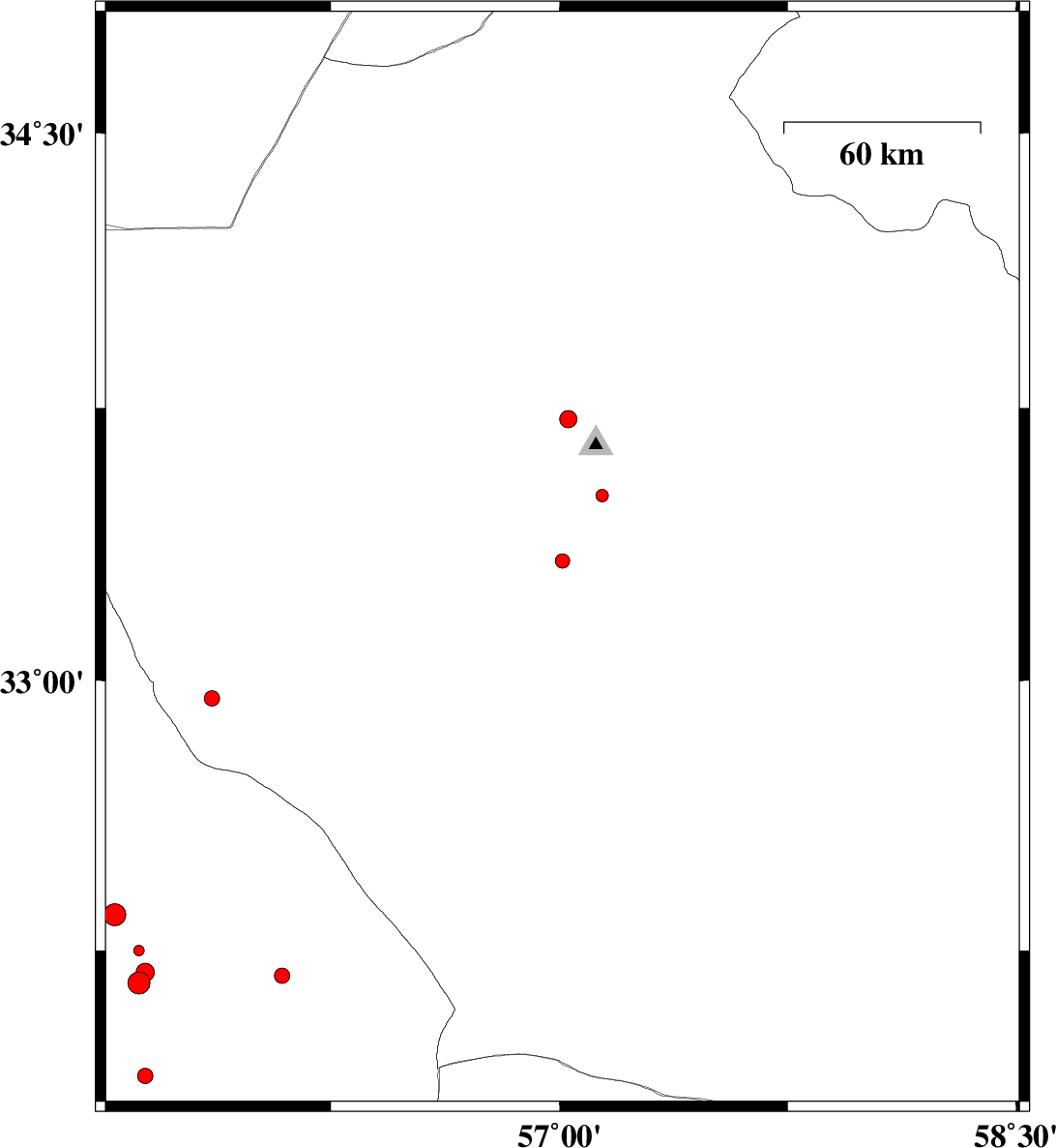 2014/05/06 | 00:53:55.9 | 05:23:55.9 | 33.51 | 57.14 | 14 | ML:1.9 | Yazd Province, 22 km East of Tabas | ||