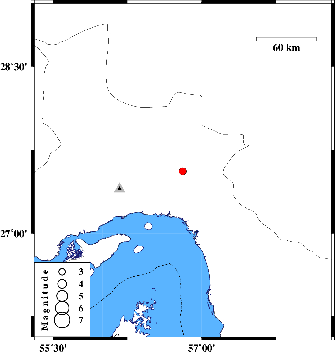 2014/05/27 | 17:38:04.6 | 22:08:04.6 | 27.56 | 56.81 | 17 | ML:3.4 | Hormozgan Province, 45 km North-West of Dehbarez | ||