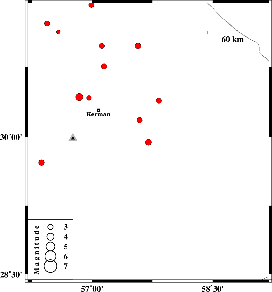 2014/06/03 | 09:50:34.3 | 14:20:34.3 | 29.94 | 57.7 | 14 | ML:3.4 | Kerman Province, 71 km South-East of Kerman | ||