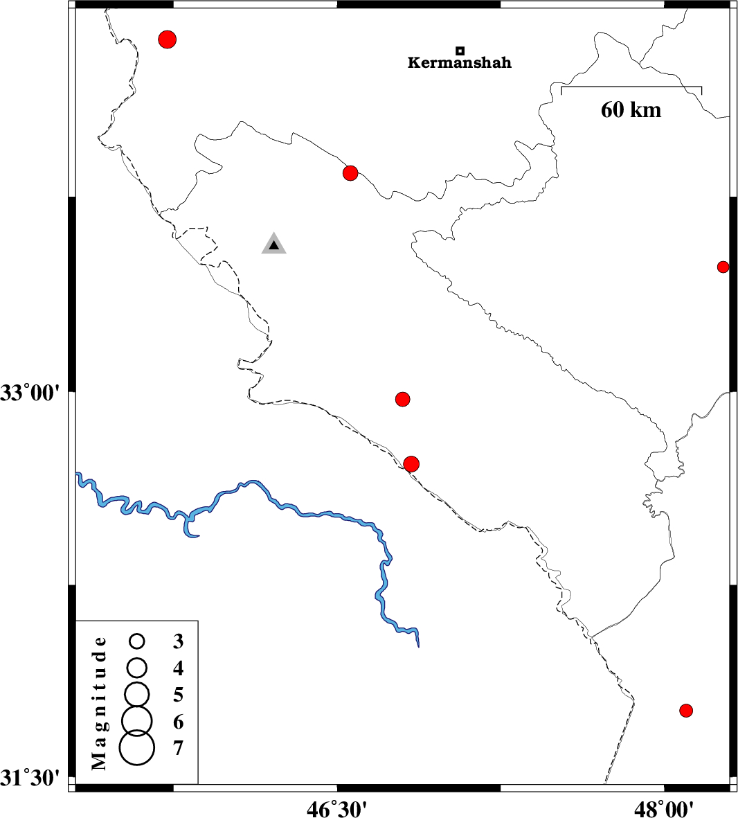 | 2014/06/05 | 17:04:53.6 | 21:34:53.6 | 32.97 | 46.8 | 18 | ML:2.9 | Ilam Province, 50 km South-West of Darreh Shahr | ||