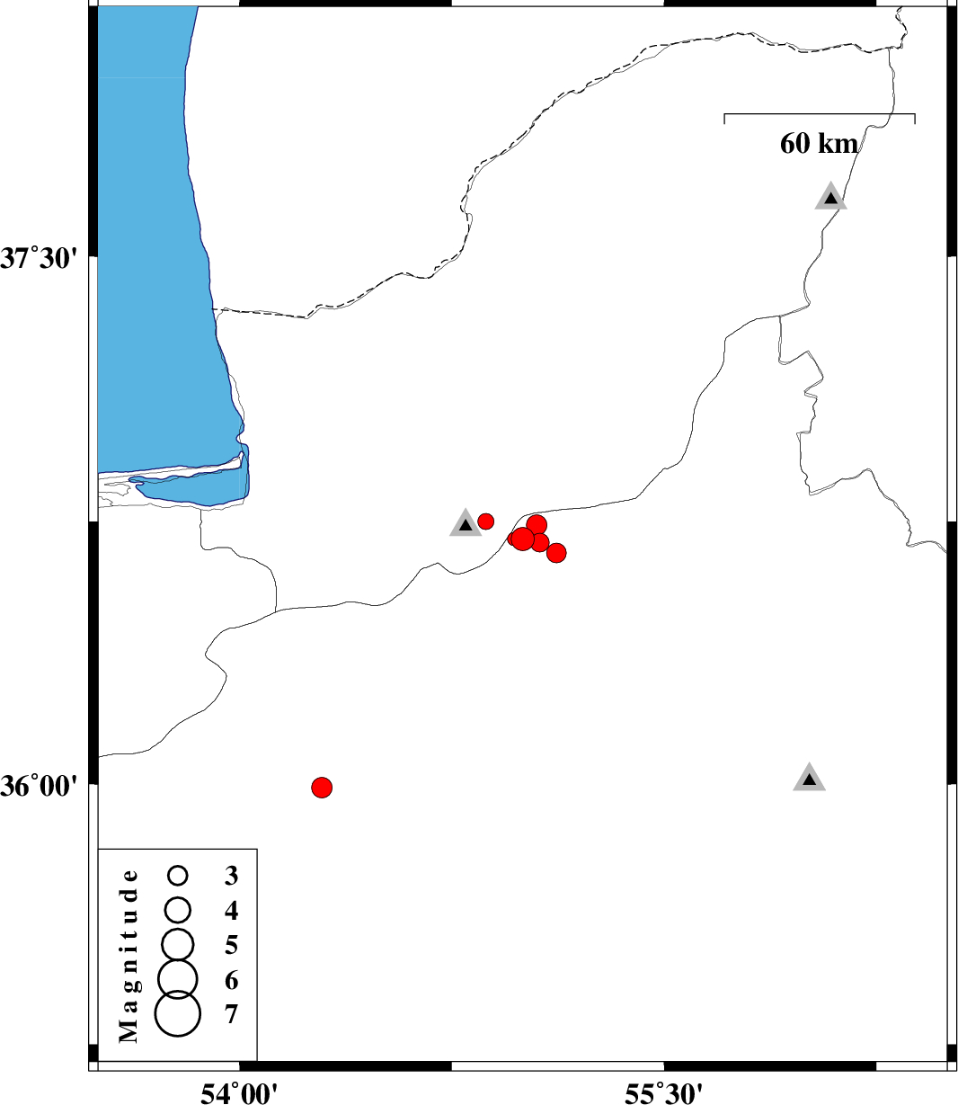 | 2014/06/06 | 12:54:29.6 | 17:24:29.6 | 36.7 | 55 | 17 | ML:3.6 | Semnan Province, 31 km North of Shahrud | ||