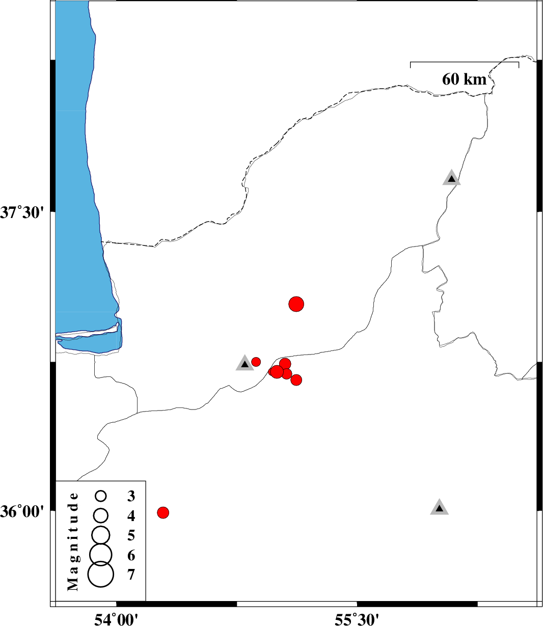 | 2014/06/06 | 12:54:29.6 | 17:24:29.6 | 36.7 | 55 | 17 | ML:3.6 | Semnan Province, 31 km North of Shahrud | ||