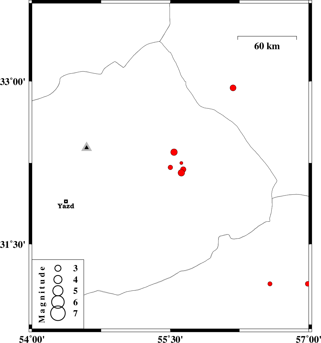 2014/05/16 | 02:10:15.2 | 06:40:15.2 | 32.25 | 55.62 | 14 | ML:1.6 | Yazd Province, 75 km North-East of Bafq |