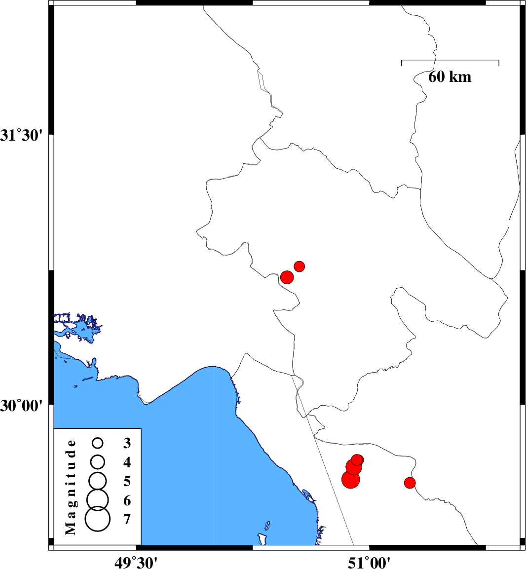 | 2014/05/22 | 18:01:27.7 | 22:31:27.7 | 29.69 | 50.93 | 18 | ML:2.9 | Bushehr Province, 42 km North-East of Bandar-e genaveh | ||