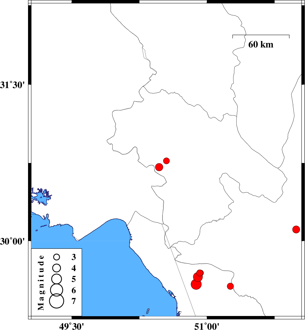 2014/05/23 | 05:26:48.4 | 09:56:48.4 | 29.69 | 50.92 | 14 | ML:3.3 | Bushehr Province, 42 km North-East of Bandar-e genaveh | ||