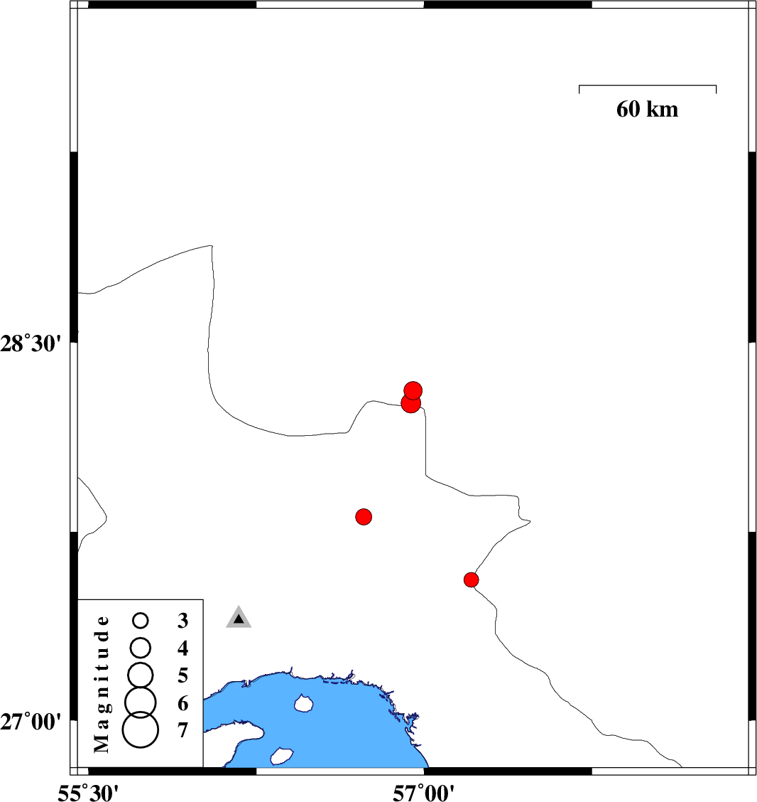 2014/06/11 | 06:06:33.0 | 10:36:33.0 | 28.26 | 56.94 | 14 | ML:3.9 | Kerman Province, 81 km North-West of Kahnuj |
