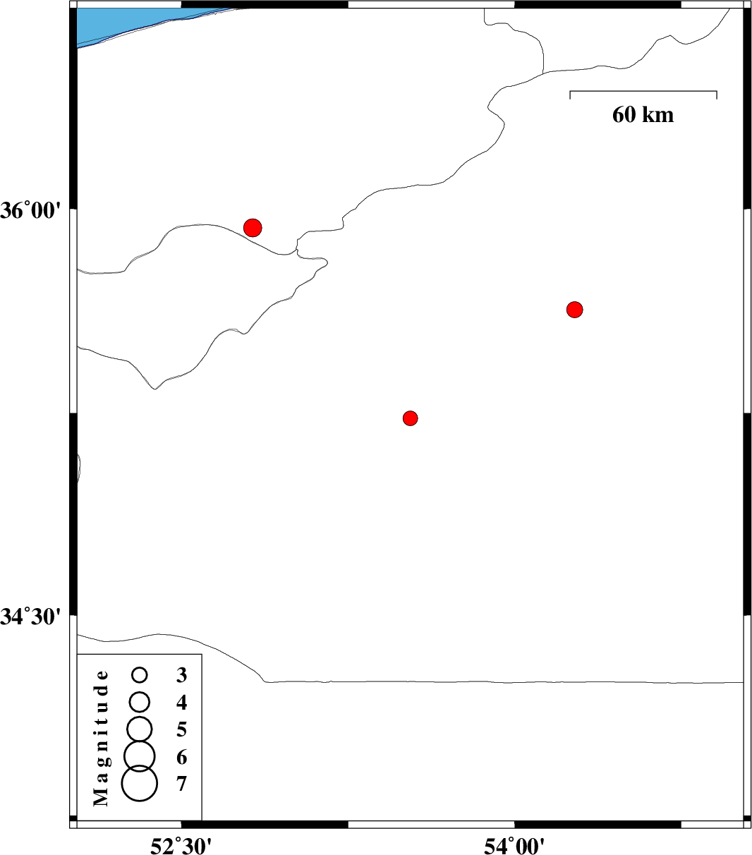 | 2014/06/16 | 23:17:57.7 | 03:47:57.7 | 35.23 | 53.53 | 37 | ML:2.9 | Semnan Province, 40 km South-East of Semnan | ||