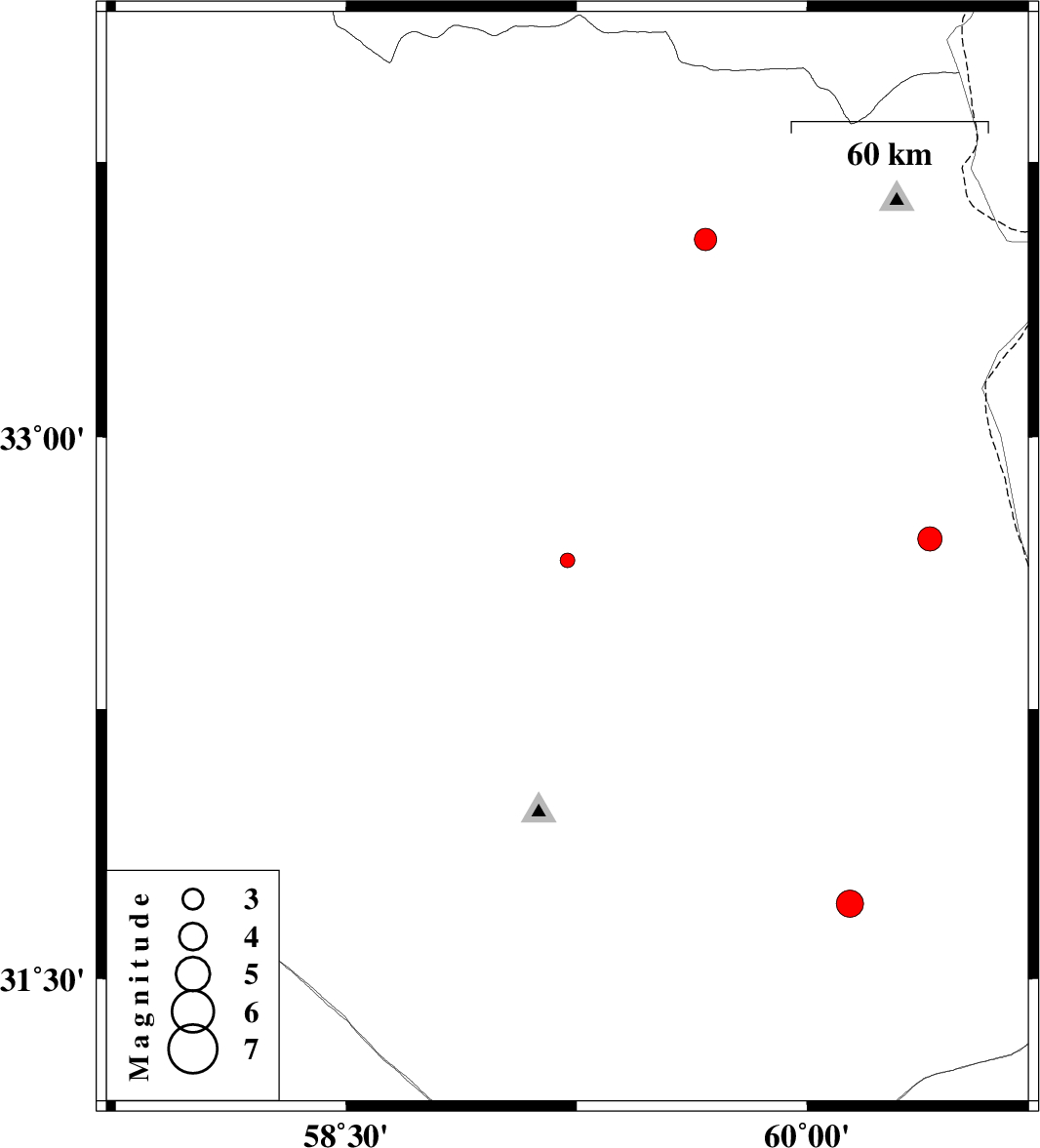 2014/06/16 | 01:34:52.9 | 06:04:52.9 | 31.71 | 60.14 | 18 | ML:3.9 | Khorasan(south) Province, 22 km North-East of Nehbandan | ||