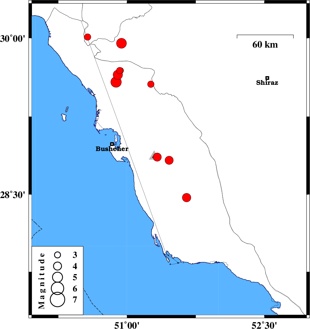2014/06/07 | 02:43:30.4 | 07:13:30.4 | 28.86 | 51.33 | 16 | ML:4.1 | Bushehr Province, 7 km Ahram | ||