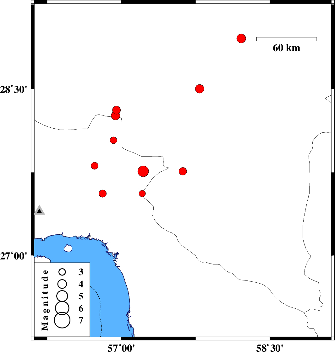 2014/06/25 | 14:20:11.1 | 18:50:11.1 | 27.76 | 57.62 | 14 | ML:3.5 | Kerman Province, 22 km South of Kahnuj | ||
