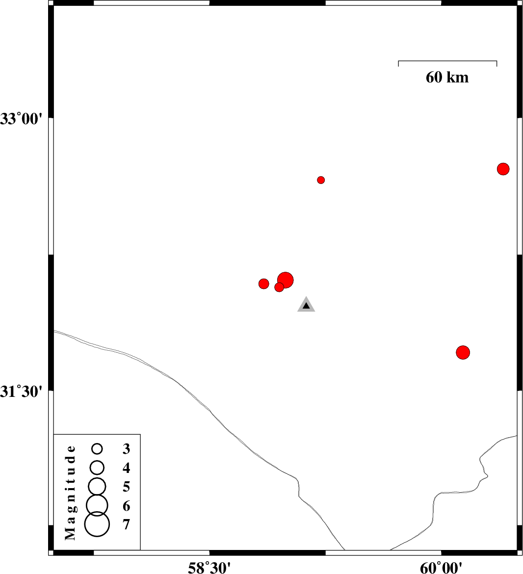2014/06/28 | 19:31:37.6 | 00:01:37.6 | 32.07 | 58.95 | 14 | ML:2.7 | Khorasan(south) Province, 96 km South-West of Birjand | ||