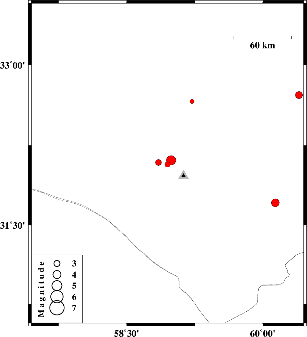 2014/06/28 | 19:31:37.6 | 00:01:37.6 | 32.07 | 58.95 | 14 | ML:2.7 | Khorasan(south) Province, 96 km South-West of Birjand | ||