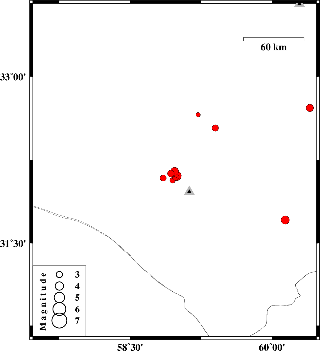 2014/06/16 | 01:34:52.9 | 06:04:52.9 | 31.71 | 60.14 | 18 | ML:3.9 | Khorasan(south) Province, 22 km North-East of Nehbandan | ||
