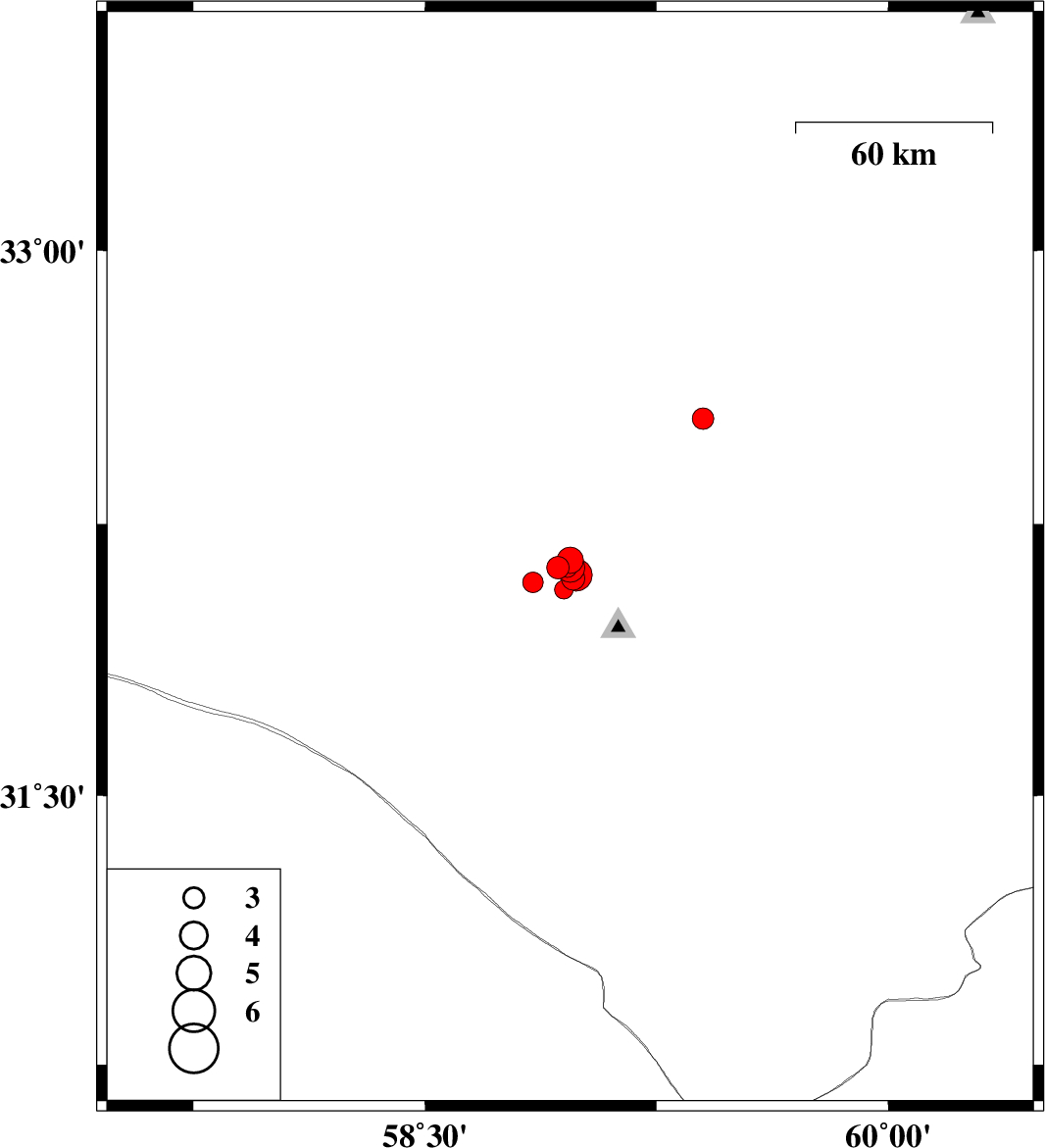 2014/06/29 | 13:49:19.5 | 18:19:19.5 | 32.1 | 58.98 | 14 | ML:3.4 | Khorasan(south) Province, 92 km South-West of Birjand | ||
