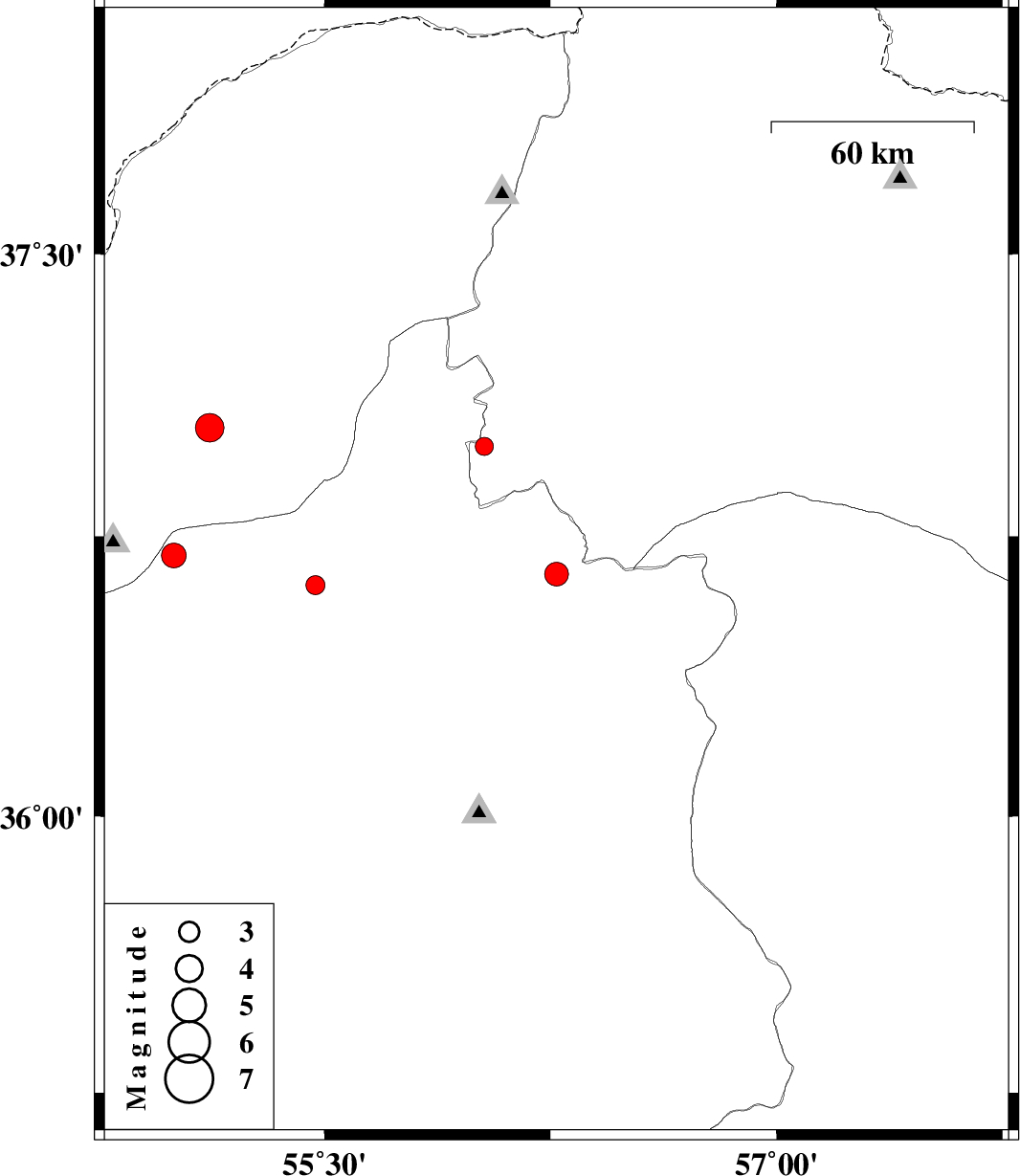 | 2014/06/06 | 12:54:29.6 | 17:24:29.6 | 36.7 | 55 | 17 | ML:3.6 | Semnan Province, 31 km North of Shahrud |