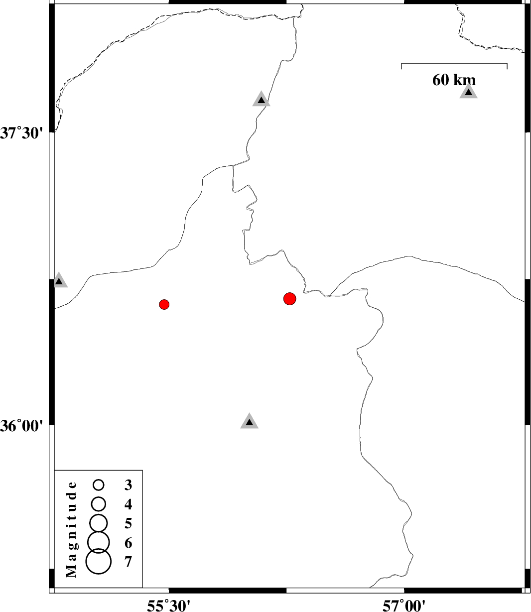 | 2014/07/02 | 13:01:26.1 | 17:31:26.1 | 36.62 | 55.47 | 10 | ML:2.8 | Semnan Province, 68 km South of Minodasht | ||